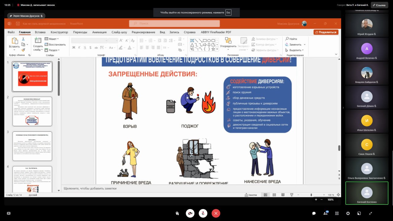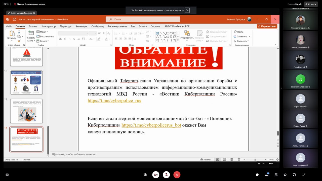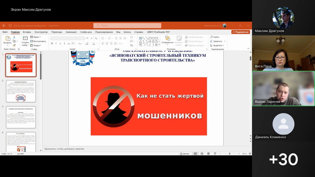 Вадим Артёмович рассказал ребятам о распространённых способах обмана населения мошенниками. Сотрудник полиции подробно проанализировал виды дистанционного мошенничества. Он объяснил, как действует схема, когда звонят якобы сотрудники банка и сообщают о том, что мошенники пытаются оформить кредит или перевести деньги со счетов их клиентов. При поступлении данных звонков, сотрудник полиции настоятельно рекомендовал незамедлительно прерывать телефонный разговор и не сообщить никому реквизиты своих банковских карт. Студентов предостерегли от установки на гаджетах сомнительных приложений, и от оказания денежной помощи тем, кто пишет с аккаунтов якобы их знакомых или родственников. Особое внимание подростков было акцентировано на предостережении — не быть втянутыми в преступную террористическую деятельность.