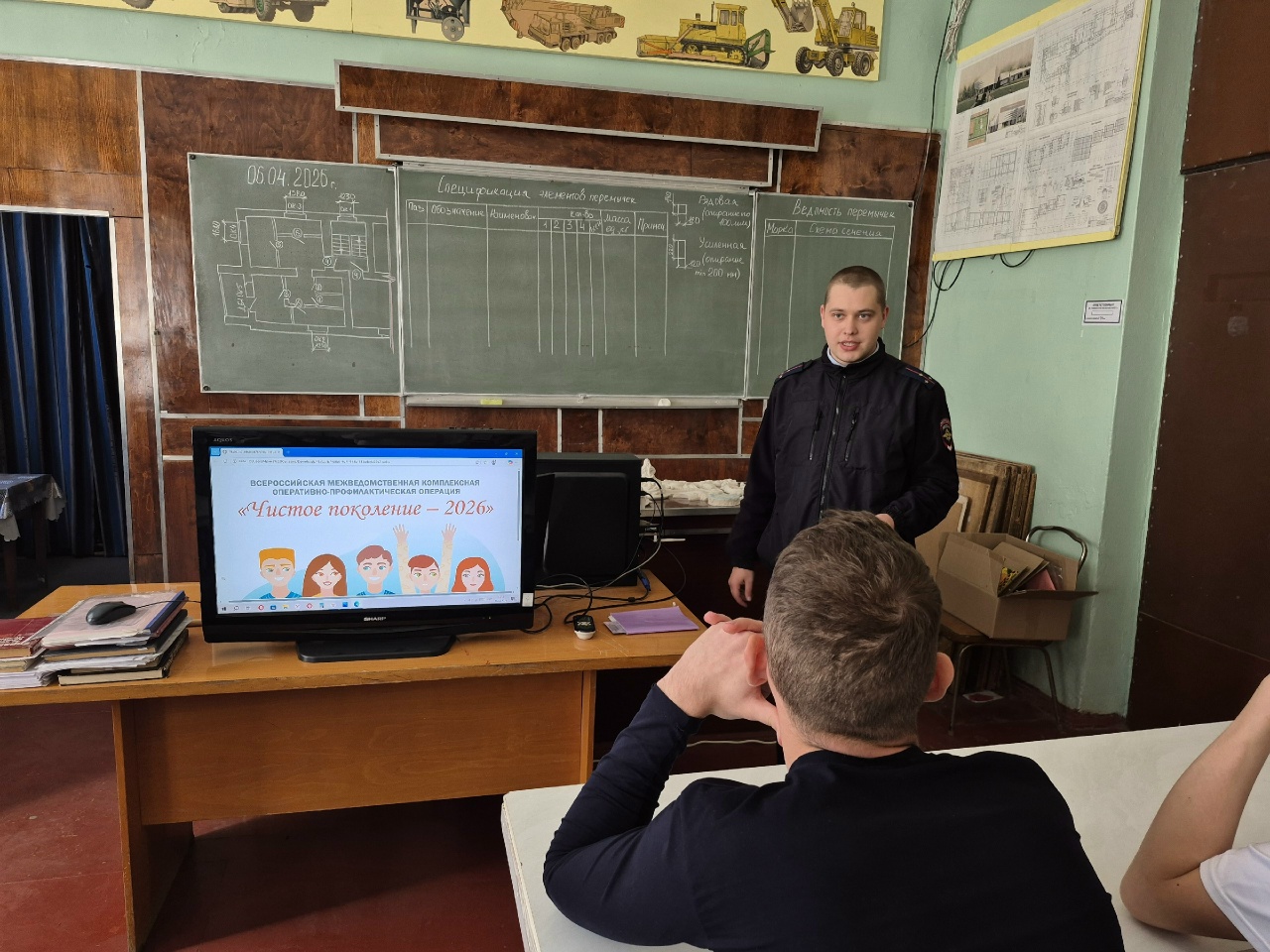 В рамках межведомственной комплексной оперативно-профилактической операции «Чистое поколение – 2026» в техникуме состоялась серьёзная и очень актуальная встреча обучающихся с инспектором по делам несовершеннолетних ОУП и ПДН ОМВД России (Ясиноватский) В.А. Ларичевым. Беседа была направлена на формирование у подростков негативного отношения к незаконному потреблению наркотических и психотропных веществ, формированию правового сознания и законопослушного поведения.