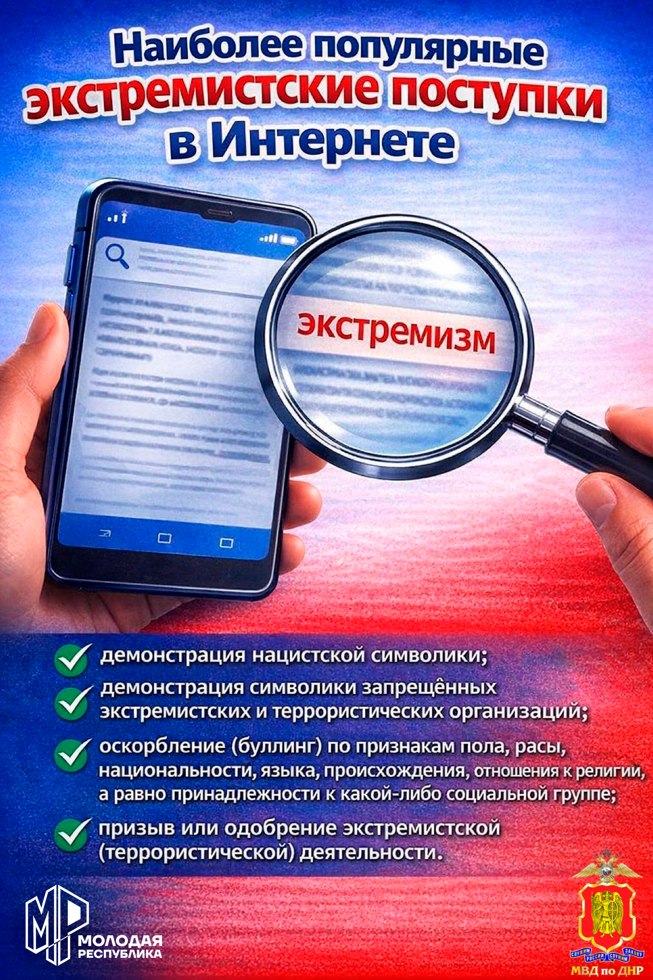 — хулиганство, вандализм, осквернение мест захоронения, публичную демонстрацию нацистской символики, распространение экстремистских материалов, публичное разжигание национальной или расовой вражды, причинение вреда здоровью и убийство из-за национальной или расовой ненависти, терроризм.