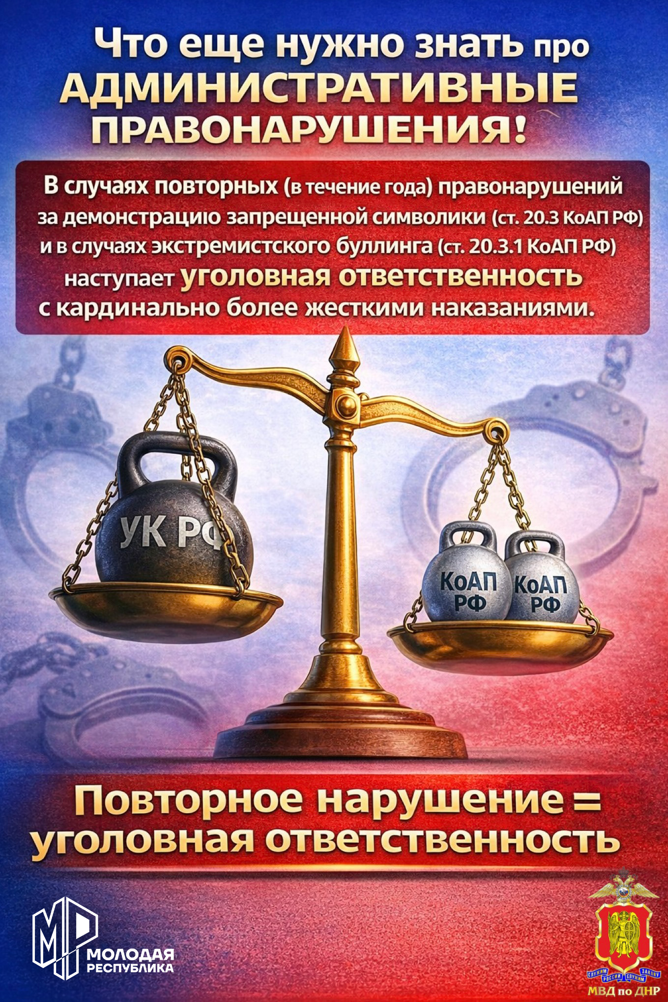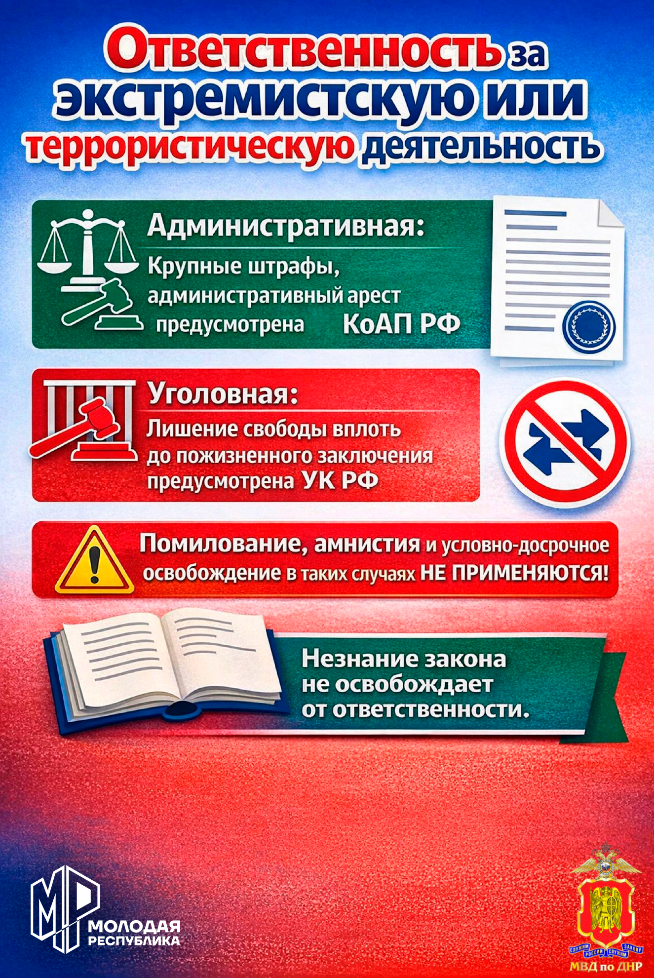 Нужно знать и помнить! За осуществление экстремистской деятельности граждане Российской Федерации, иностранные граждане и лица без гражданства несут: уголовную, административную, гражданско-правовую ответственность в установленном законодательством РФ порядке.